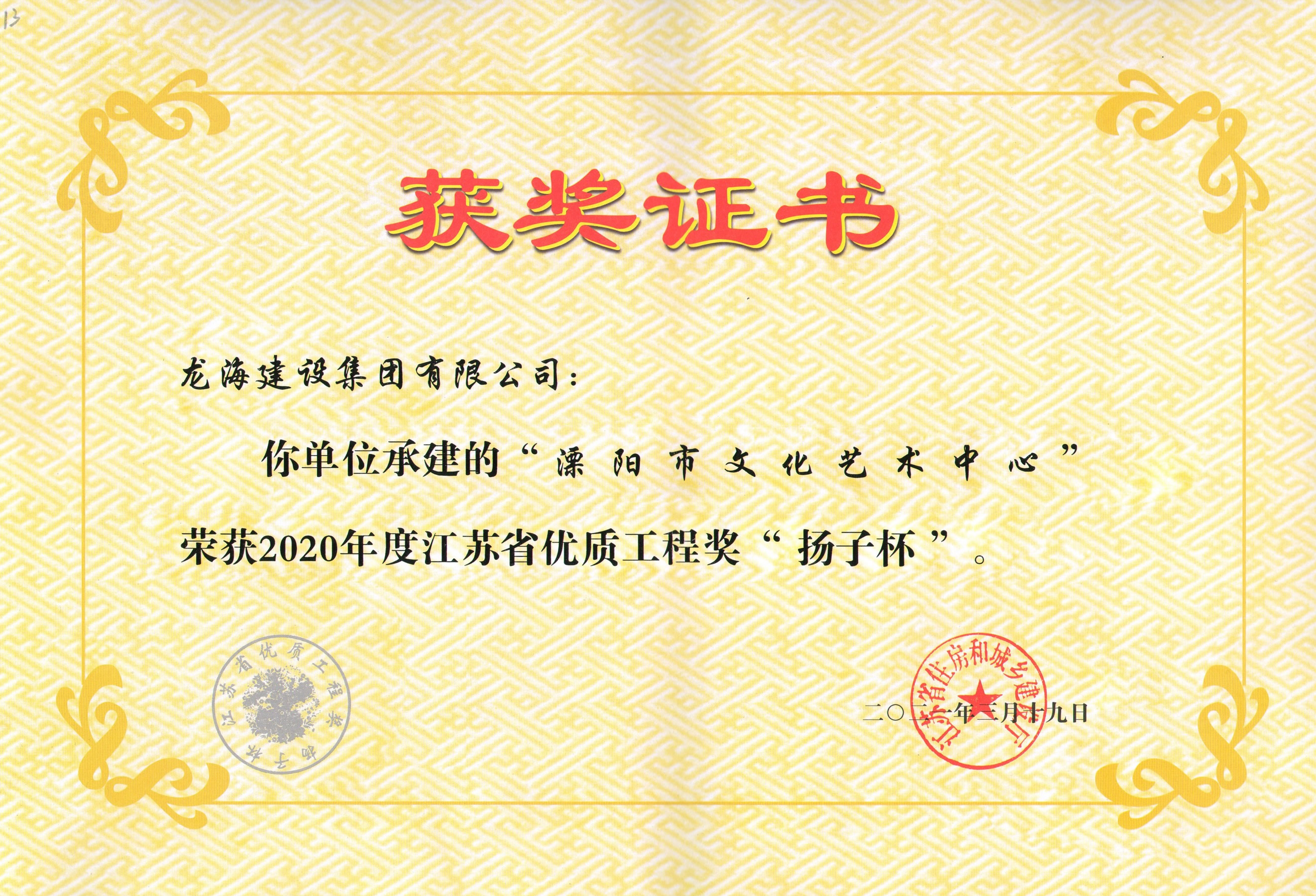 近日,我司承建的“溧陽(yáng)市文化藝術(shù)中心”喜獲2020年度江蘇省優(yōu)質(zhì)工程獎(jiǎng)“揚(yáng)子杯”。該獎(jiǎng)為江蘇省建筑工程質(zhì)量最高榮譽(yù)獎(jiǎng),由江蘇省住房和城鄉(xiāng)建設(shè)廳組織,江蘇省建筑行業(yè)協(xié)會(huì)等單位參與評(píng)選。